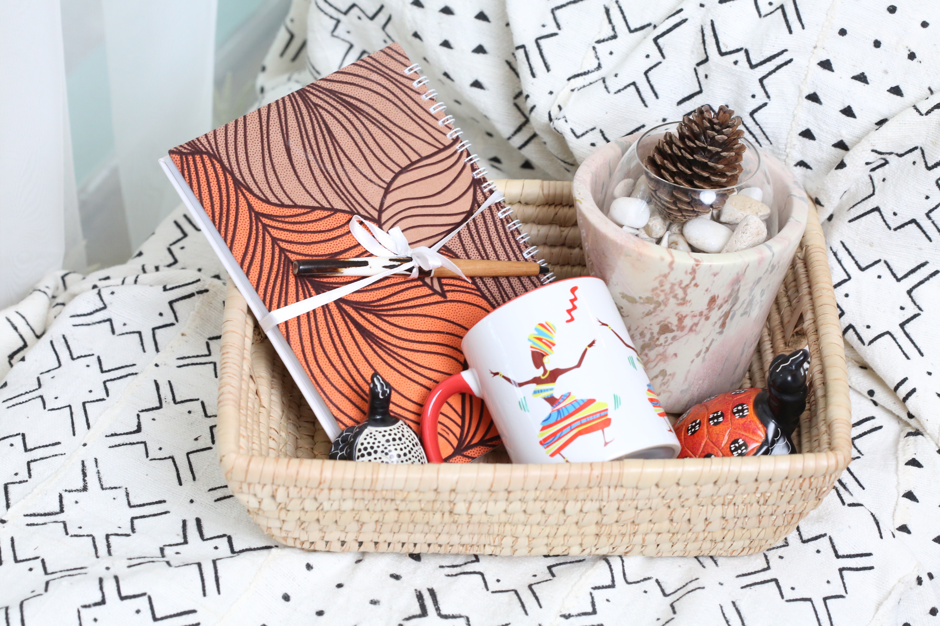 Elevate your note-taking experience with the Ankara Premium Leather Notebook. Crafted with precision and care, this exquisite notebook combines timeless elegance with modern functionality. Whether you're a student, a professional, or a creative writer, our Ankara Notebook is designed to inspire your thoughts and ideas. 2 Branded cups - 8.03 Dollars Each Ankara notebook - 10.07 Dollars Bone pen - 1.34 Dollars Elephant candle holder - 5.37 Dollars